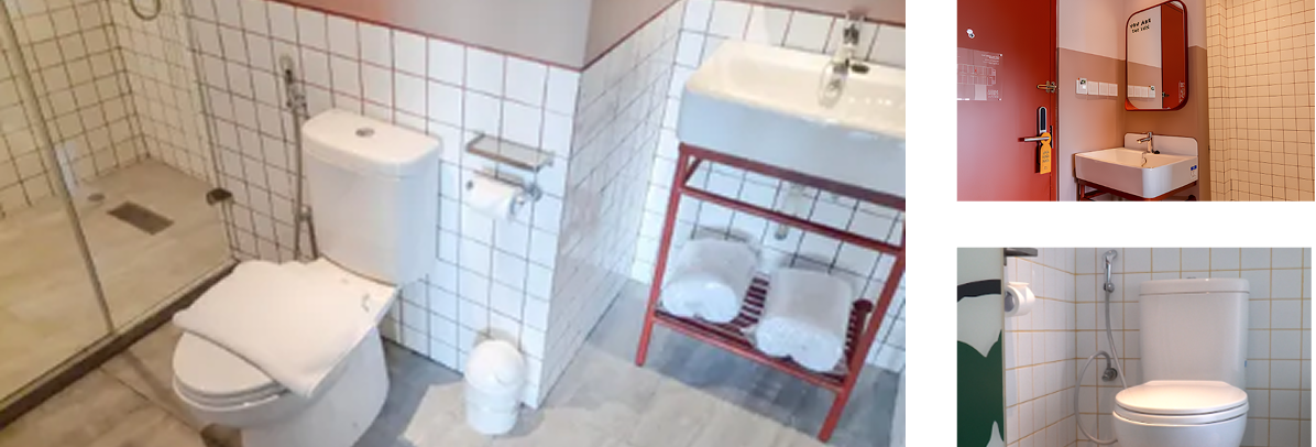Sementara itu, pilihan closet seperti American Standard Luxia dan Winplus memberikan kenyamanan optimal bagi tamu, dengan desain yang memudahkan pembersihan dan sistem flushing yang efisien.