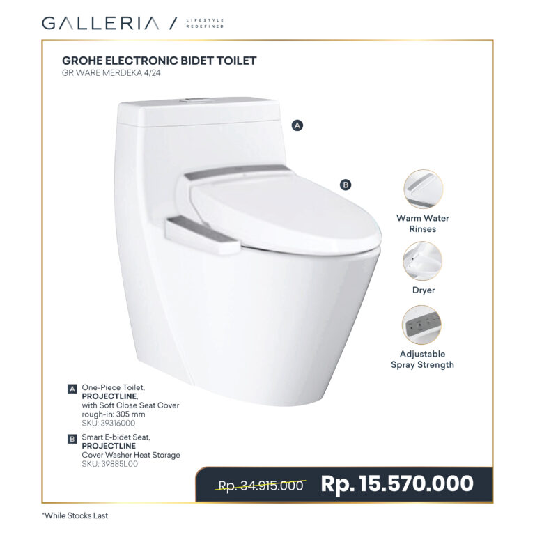 Memilih Grohe toilet berarti berinvestasi pada kenyamanan, kebersihan, dan efisiensi air untuk jangka panjang. Inovasi teknologi, material premium, serta desain elegan menjadikan setiap toilet Grohe pilihan tepat bagi hunian modern. Kunjungi showroom Galleria untuk melihat langsung koleksi Grohe toilet dan konsultasikan kebutuhan Anda dengan tim profesional kami.