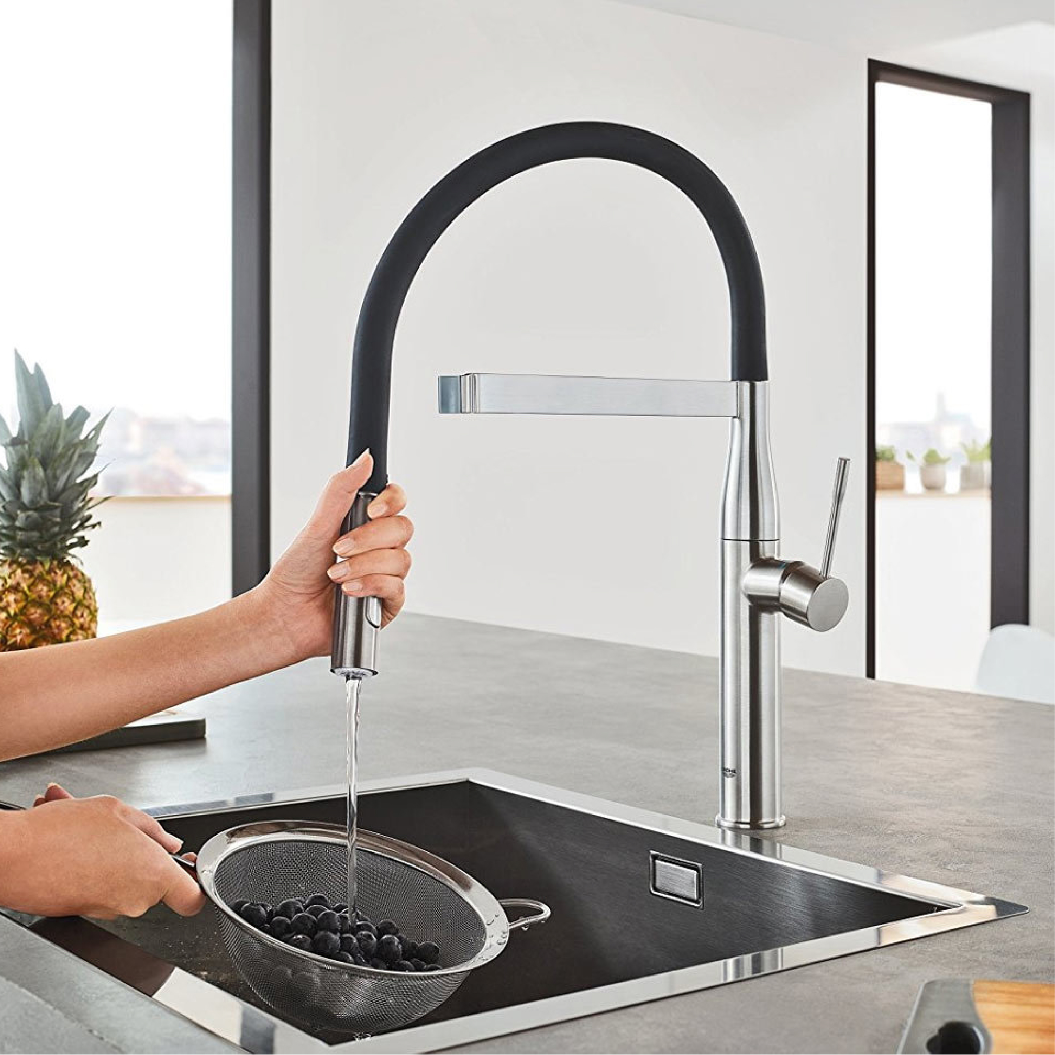 • With flexible, hygienic GROHFlexx kitchen santoprene hose