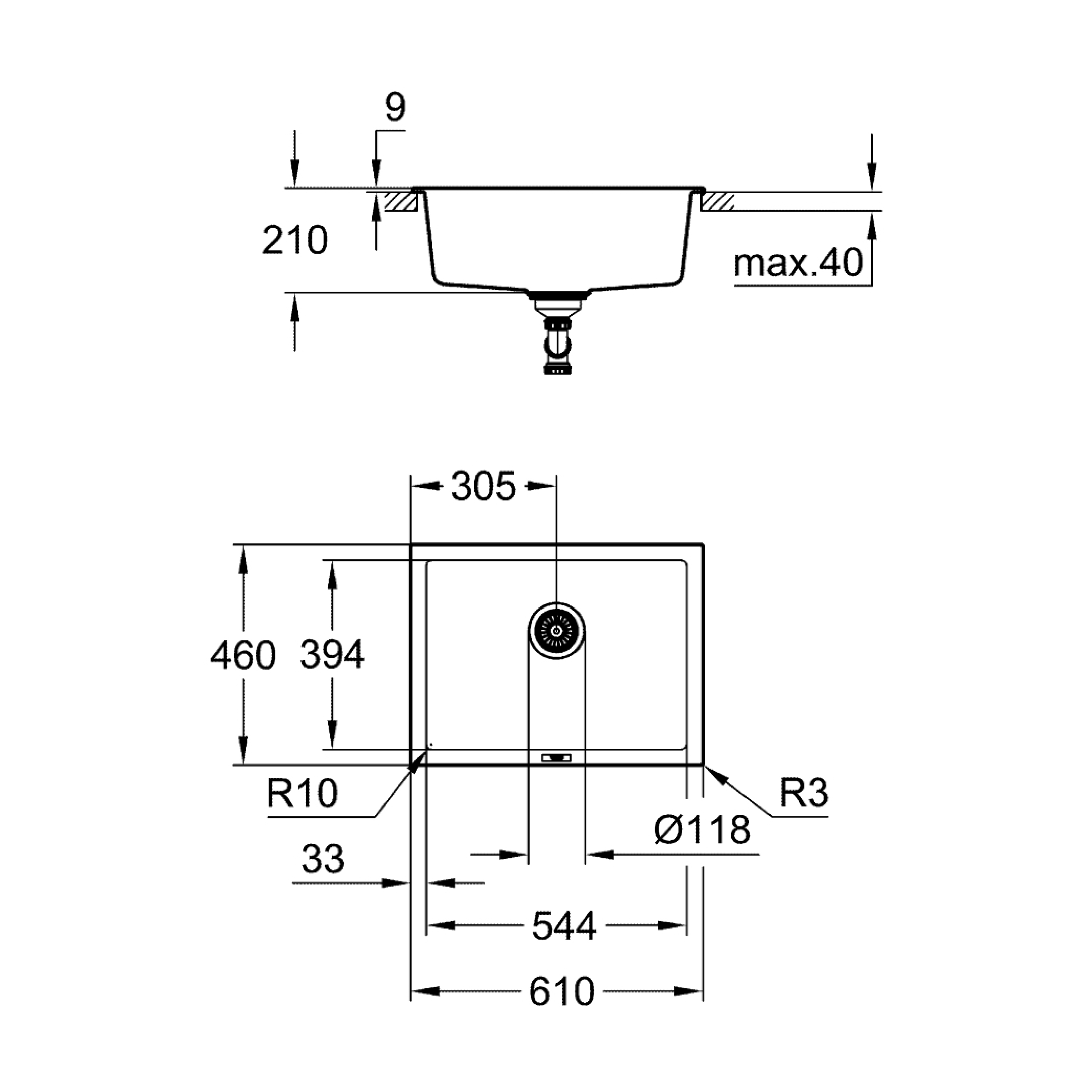 • Cut-out (undermount): 543 x 393 mm