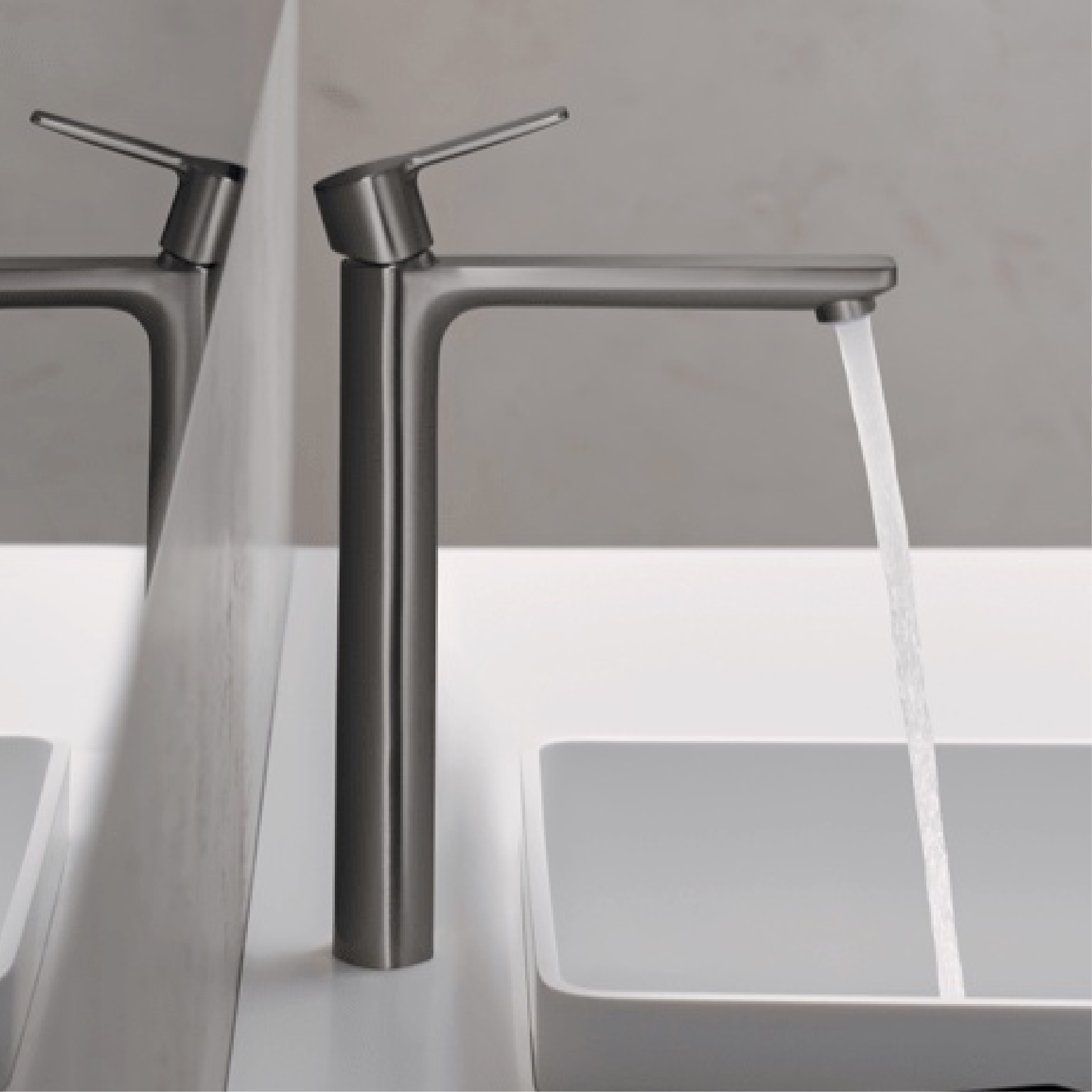 With its tall and elegant cylindrical body and crisp rectangular handle and spout the GROHE Lineare single-lever basin mixer goes perfectly