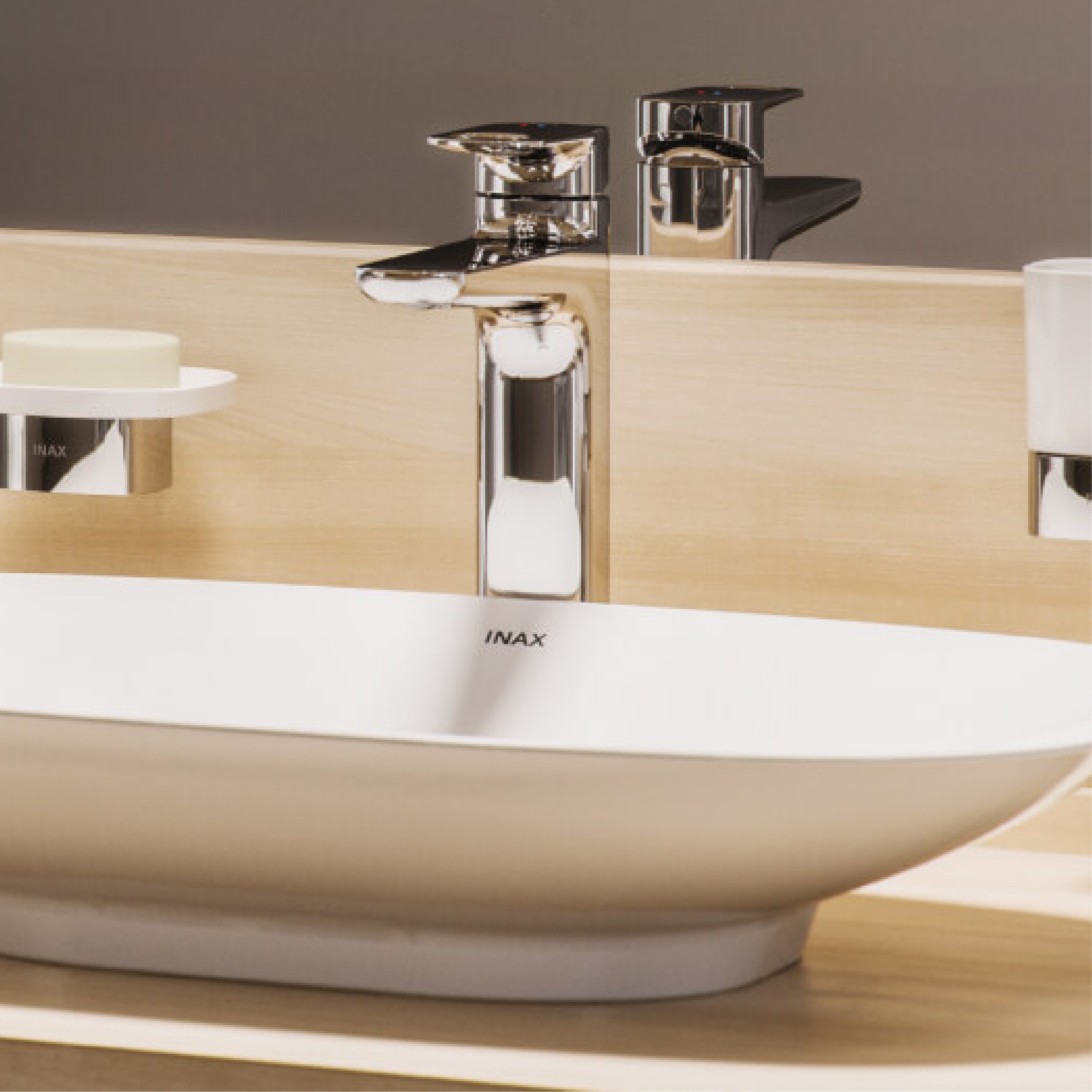The basin mixer has a holed lever which is easy to handle by just the tip of your finger and the INAX Blue color appears when you raise the lever, ensuring an intuitive user experience.