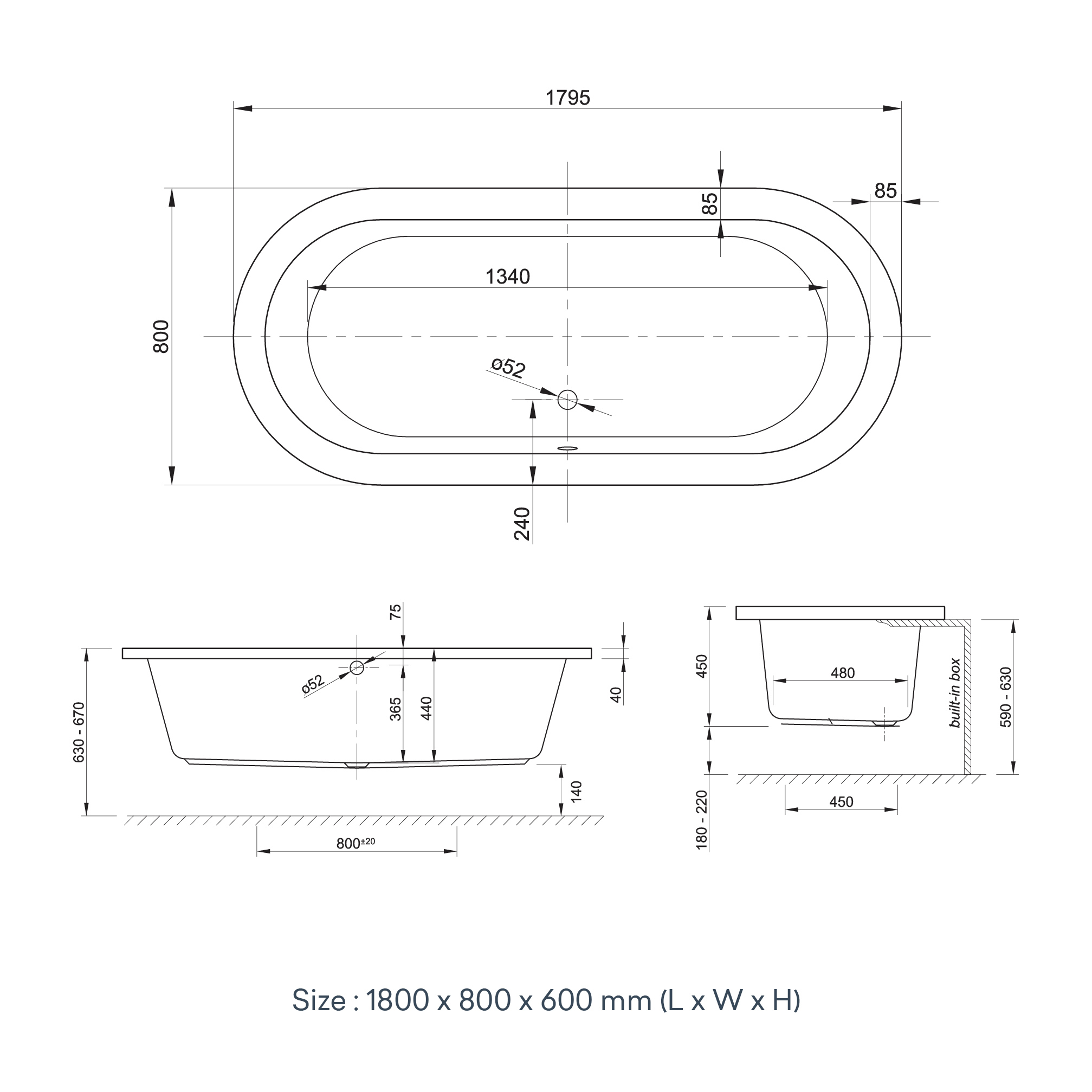 • Dimensions: 1795 x 800 x 440 mm (L x W x H)