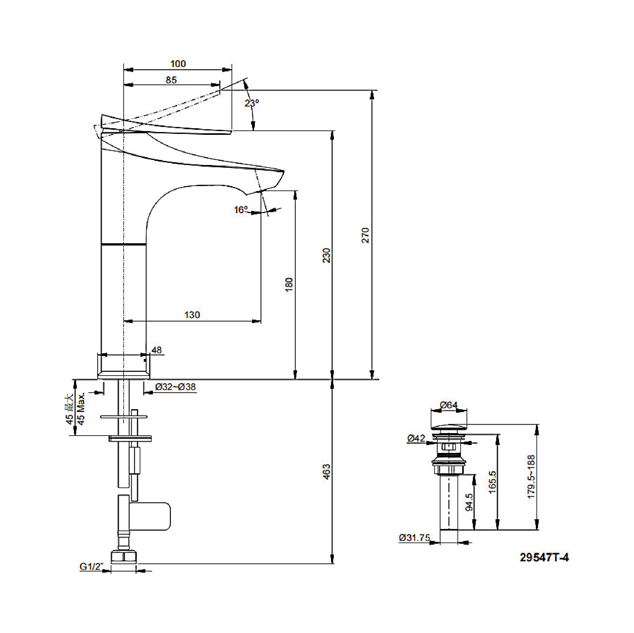 • Includes stationary spout and pop-up drain.