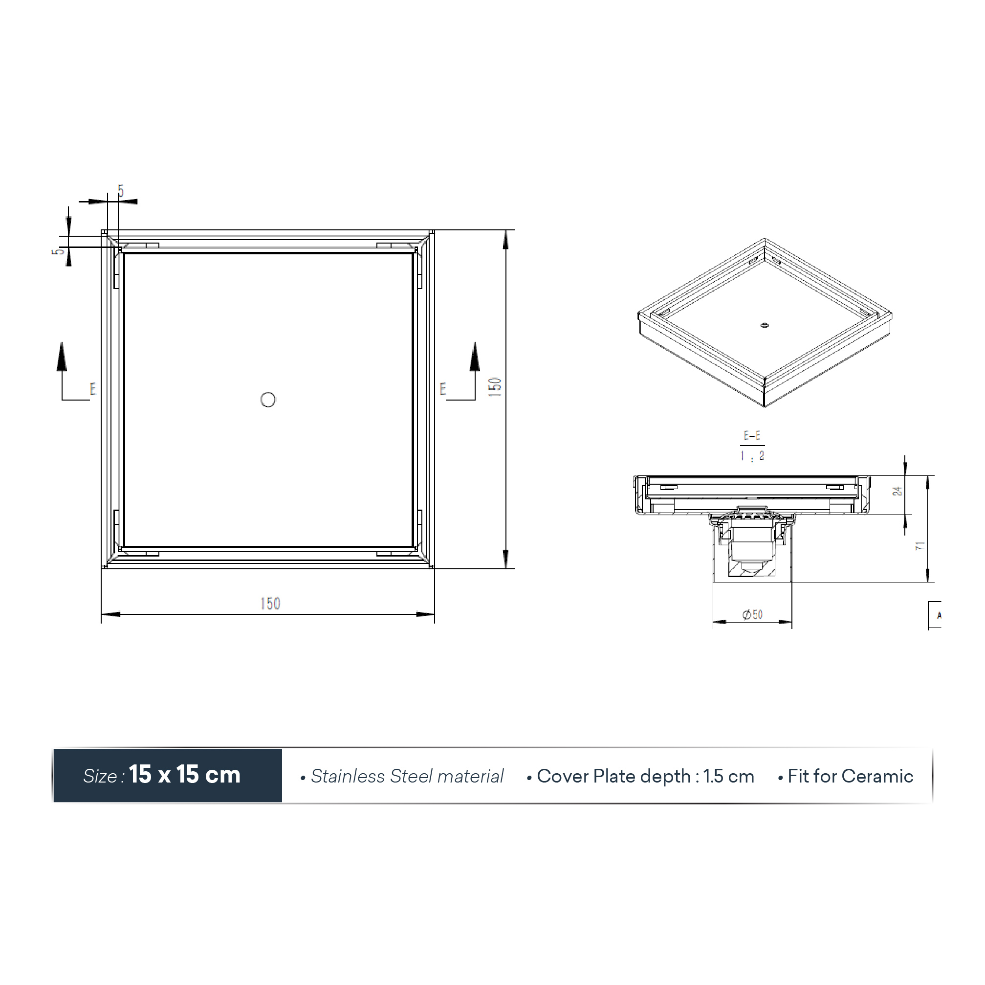 • Conceal Tile Drain – 15 x 15 cm (Brush, Core diameter 5 cm)