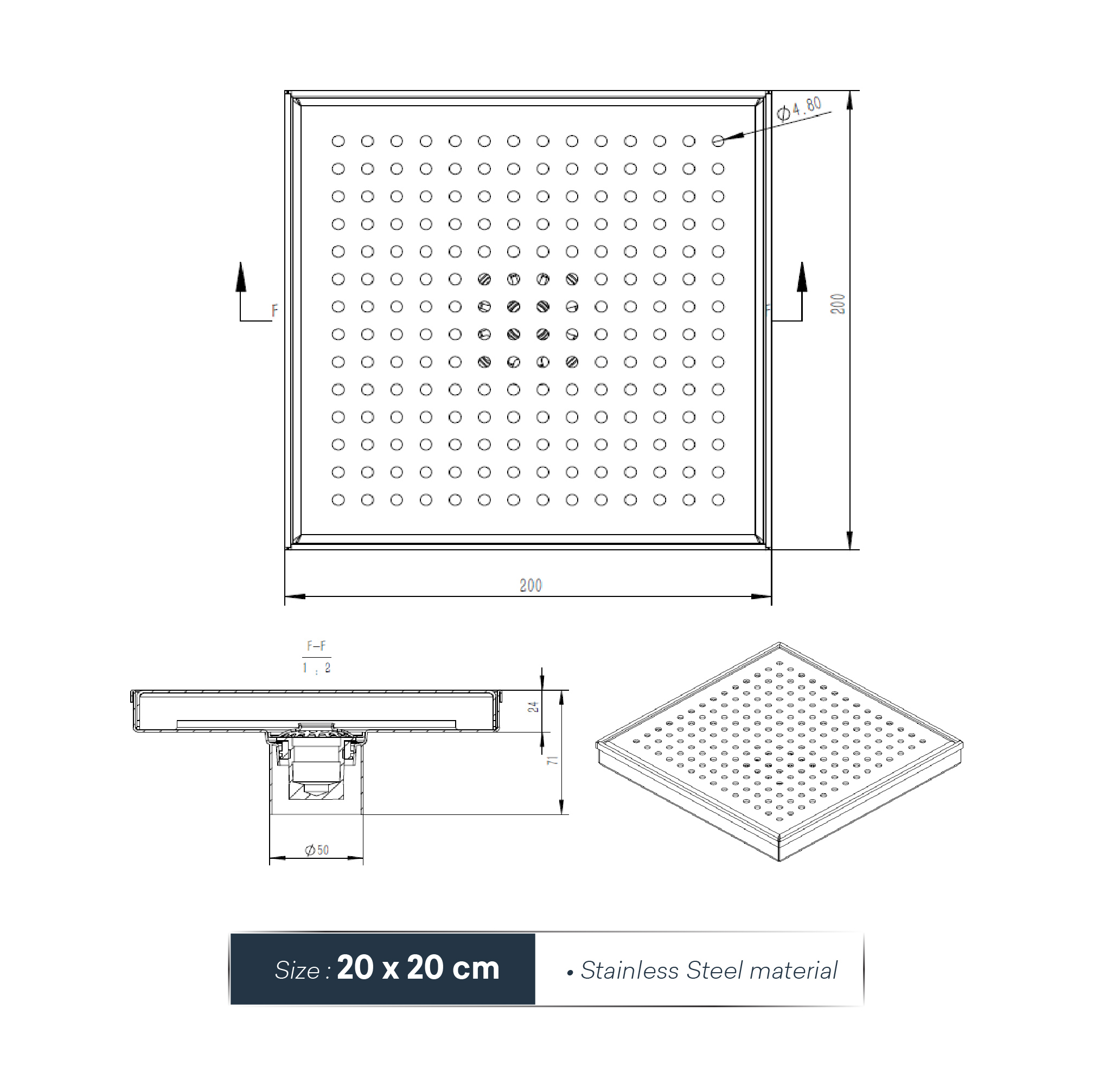 • Screen Floor Drain SS Gold 20 x 20 cm OD50 (Core diameter 5 cm)